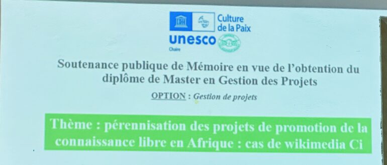 Son travail, centré sur le thème « Pérennisation des projets de promotion de la connaissance libre en Afrique : cas de Wikimedia Côte d’Ivoire », s’inscrit parfaitement dans son engagement professionnel et associatif.