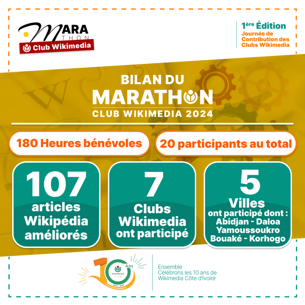 Wikimedia Côte d’Ivoire a organisé le samedi 20 avril 2024 le Marathon des Clubs Wikimedia. Cet événement a réuni, en ligne pendant 10 heures, 20 membres issus des WikiClubs sur différents articles concernant la Côte d’Ivoire repérés par l’application GAWA.