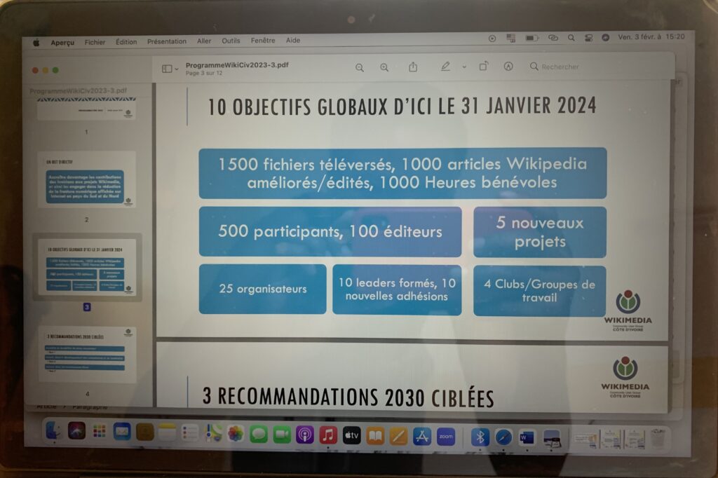 Le dernier temps fort, c’est la présentation du programme WikiCiv 2023. Pour cette campagne 2023-2024, le but directif de l’association est d’ « accroître davantage les contributions des Ivoiriens aux projets Wikimedia, et ainsi les engager dans la réduction de la fracture numérique affichée sur Internet en pays du Sud et du Nord », rappelle le Président.